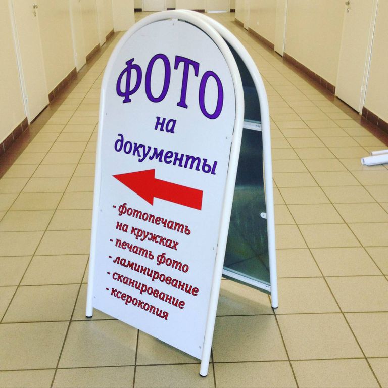 Штендер двухсторонний, 1,32 х 0,67 м., рекламное поле из оцинкованного железа размером 1,2 х 0,6 м., полноцветная печать 720 dpi, с ламинацией.